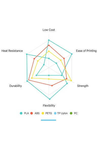 Polycarbonat (PC) ist im Vergleich zu anderen 3D-Druck-Filamenten für seine hohe Festigkeit und Haltbarkeit bekannt. PC-Filament wird häufig für Automobilteile, Schutzkleidung und industrielle Komponenten verwendet. Es wird auch für den Druck von Objekten verwendet, die ein hohes Maß an Hitzebeständigkeit erfordern, wie z. B. Küchenutensilien und medizinische Geräte.